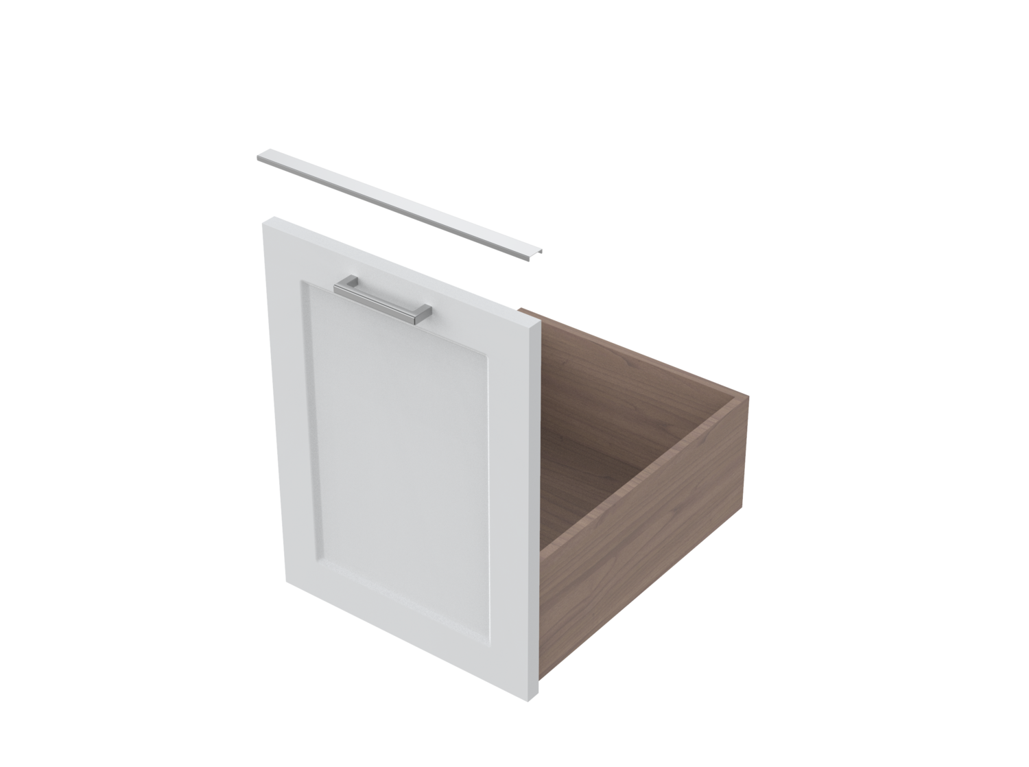 Installation is achieved by removing the double back tape seal, carefully aligning on drawer front and pressing down. Please note the the adhesive is very strong so initial alignment is critical. The image below shows installation: